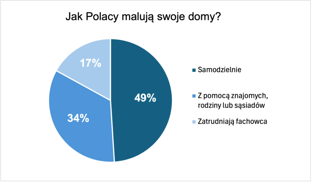 Większość Polaków decyduje się na samodzielne malowanie – aż 49% respondentów wykonuje te prace we własnym zakresie. Kolejne 34% korzysta z pomocy znajomych lub rodziny, a na skorzystanie z usług fachowców decyduje się 17%. Decyzja o malowaniu samodzielnie lub z udziałem fachowca najczęściej zależy od budżetu (57%), dostępności czasu (47%) oraz od wielkości powierzchni do pomalowania (46%) i stopnia trudności (46%).