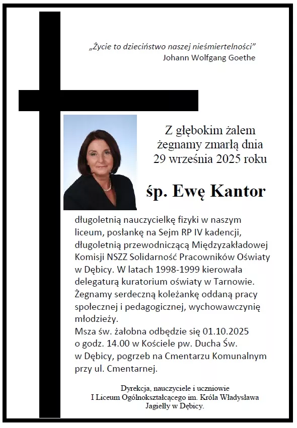 Ewa Kantor, urodzona w 1956 roku w Dębicy, zmarła 29 września 2025 roku. Była znaną nauczycielką fizyki, zaangażowaną działaczką związkową i posłanką na Sejm IV kadencji. Przez całe życie związana była z regionem Podkarpacia, zarówno zawodowo, jak i społecznie.