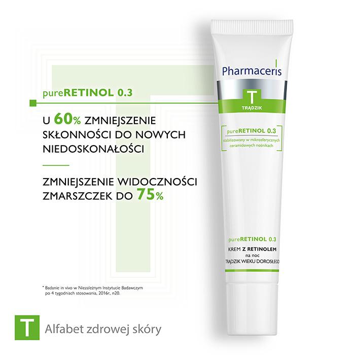 Krem nocny dla osób dorosłych z objawami trądziku oraz działaniem przeciwzmarszczkowym. Zawiera 0,3 % czystego retinolu w mikrosferycznych, ceramidowych nośnikach, co zwiększa stabilność retinolu i zmniejsza ryzyko podrażnień.