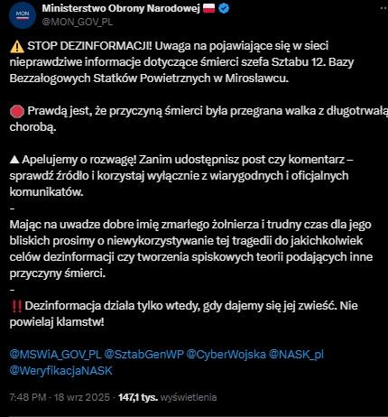 ⚠️ STOP DEZINFORMACJI! Uwaga na pojawiające się w sieci nieprawdziwe informacje dotyczące śmierci szefa Sztabu 12. Bazy Bezzałogowych Statków Powietrznych w Mirosławcu.