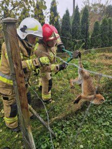 Nietypowa akcja w Dębicy! Strażacy z JRG 2 oraz druhowie z OSP Głowaczowa ruszyli na ratunek… lisowi uwięzionemu w ogrodzeniu z siatki leśnej. Zwierzę, które wplątało się w metalowe druty,