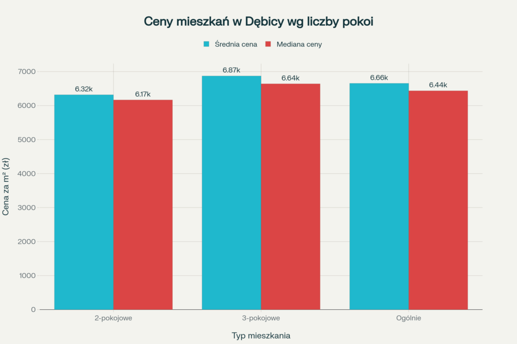 Rynek wtórny mieszkań w Dębicy charakteryzuje się zróżnicowaniem cen w zależności od wielkości lokalu. Mieszkania 2-pokojowe osiągają średnią cenę 6319 zł/m² przy medianie 6167 zł/m², podczas gdy mieszkania 3-pokojowe są droższe – średnio 6873 zł/m² z medianą 6642 zł/m². Największy rozrzut cenowy występuje w segmencie mieszkań 3-pokojowych, gdzie ceny wahają się od 6432 do 7322 zł/m².