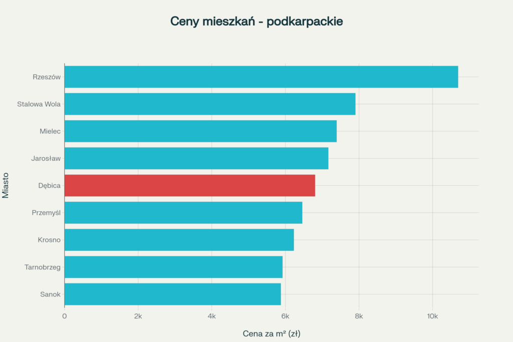 Miasta tańsze od Dębicy to Przemyśl (6458 zł/m²), Krosno (6229 zł/m²), Tarnobrzeg (5922 zł/m²) oraz Sanok (5876 zł/m²). Pozycja Dębicy w środku stawki cenowej czyni ją atrakcyjną dla kupujących, którzy poszukują kompromisu między ceną a dostępnością do infrastruktury i połączeń komunikacyjnych. Autostrada A4 przebiegająca przez miasto zapewnia doskonałe połączenie z Krakowem (80 minut) i Rzeszowem (40 minut), co dodatkowo zwiększa atrakcyjność inwestycyjną miasta.