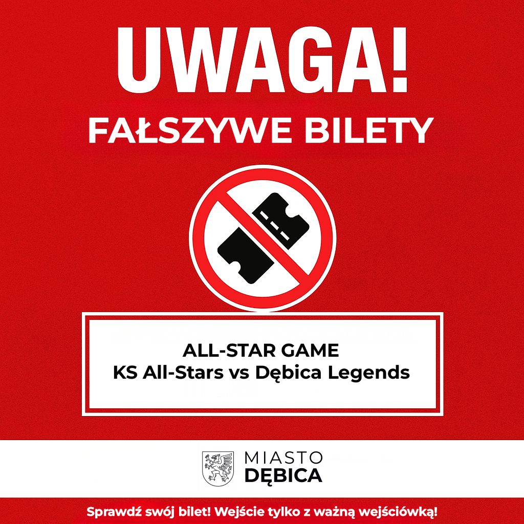 Organizatorzy meczu All-Star Game: KS All-Stars vs. Dębica Legends ostrzegają, że pojawiły się przypadki sprzedaży sfałszowanych biletów przez osoby trzecie. Prosimy o szczególną uwagę przy zakupie biletów z drugiej ręki lub od nieautoryzowanych osób i podmiotów.