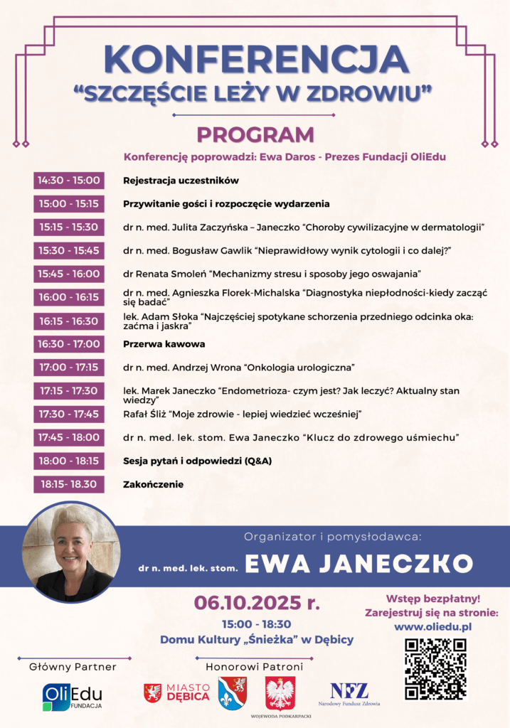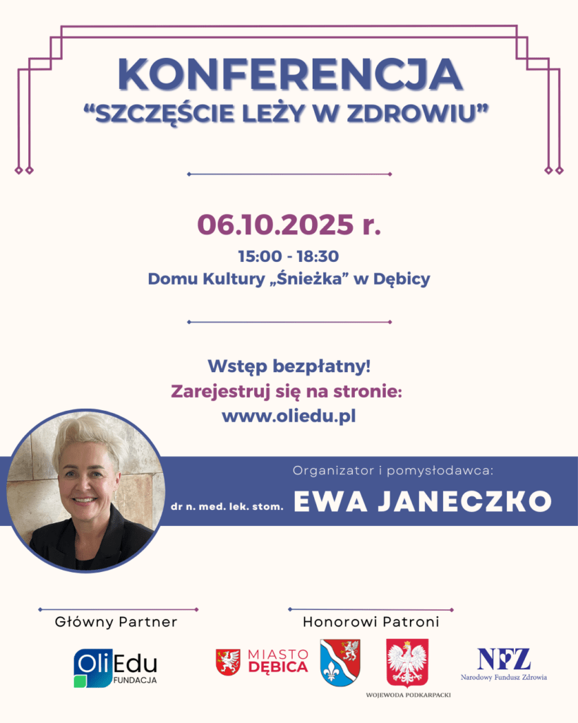 Fundacja OliEdu wraz z dr n. med. Ewą Janeczko serdecznie zapraszają na konferencję pod hasłem „Szczęście leży w zdrowiu”, która odbędzie się 6 października 2025 r. o godz. 15.00 w Domu Kultury „Śnieżka” w Dębicy.