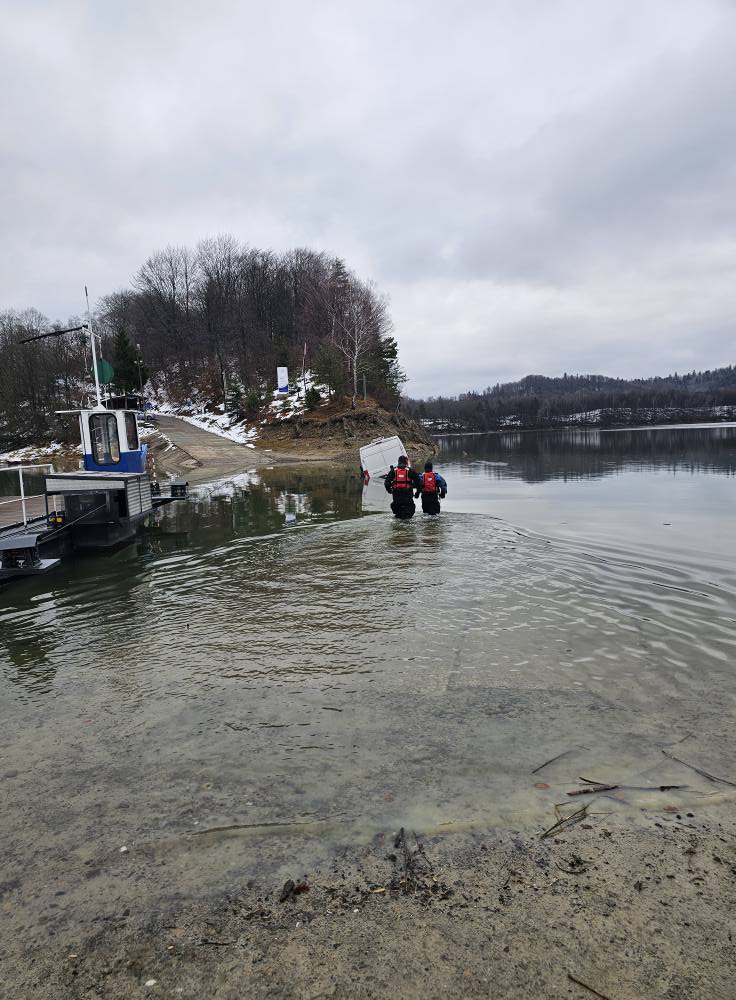 Podczas przejazdu przez wodny odcinek trasy dostawczy pojazd niespodziewanie przechylił się i zsunął z jednej z płyt, częściowo zanurzając się w Jeziorze Solińskim. Na miejsce natychmiast skierowano strażaków z OSP KSRG Polańczyk, jednostki PSP z Leska i Sanoka oraz policję. W działaniach uczestniczyli również przedstawiciele gminy Solina.