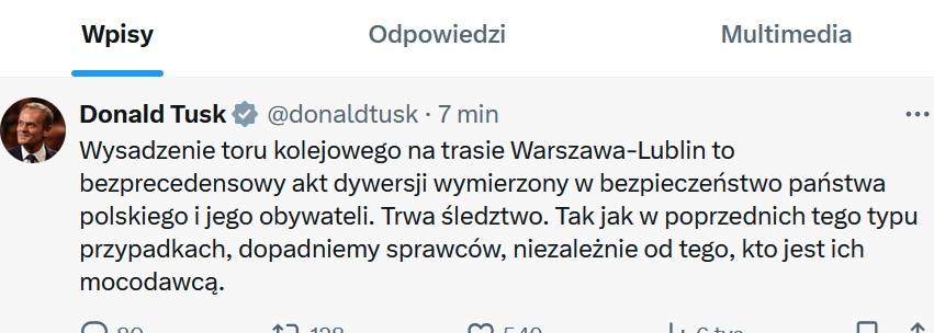 „Niestety potwierdziły się najgorsze przypuszczenia. Na trasie Warszawa-Lublin (wieś Mika) doszło do aktu dywersji. Eksplozja ładunku wybuchowego zniszczyła tor kolejowy. Na miejscu pracują służby i prokuratura. Na tej samej trasie, bliżej Lublina, również stwierdzono uszkodzenie.” – potwierdził we wpisie na portalu X premier Donald Tusk.