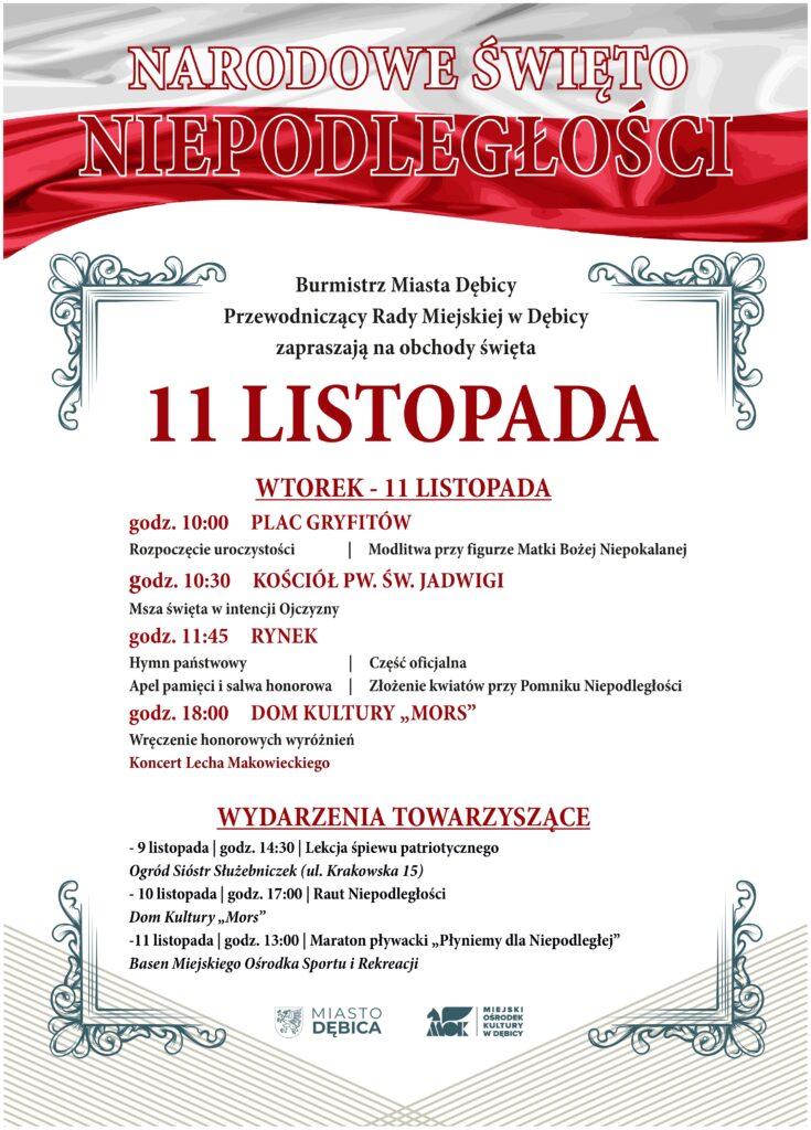 Burmistrz Miasta Dębica oraz Przewodniczący Rady Miejskiej zapraszają mieszkańców do wspólnego świętowania 107. rocznicy odzyskania przez Polskę niepodległości. Uroczystości odbędą się we wtorek 11 listopada, a w ich programie znalazły się m.in. ceremoniał patriotyczny na dębickim Rynku, koncert Lecha Makowieckiego oraz wręczenie honorowych wyróżnień. W ramach obchodów, w dniach poprzedzających święto, odbędzie się także lekcja śpiewu patriotycznego, maraton pływacki oraz Raut Niepodległości.