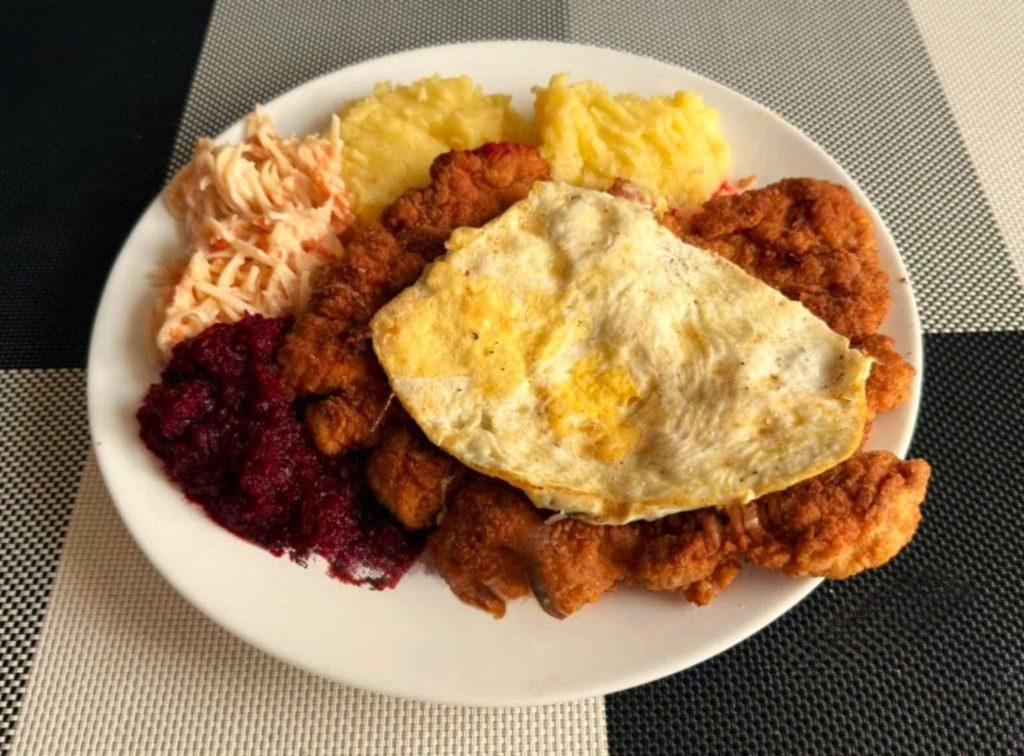 • Schabowy + ziemniaki + kapusta zasmażana + jajko sadzone – 25 zł