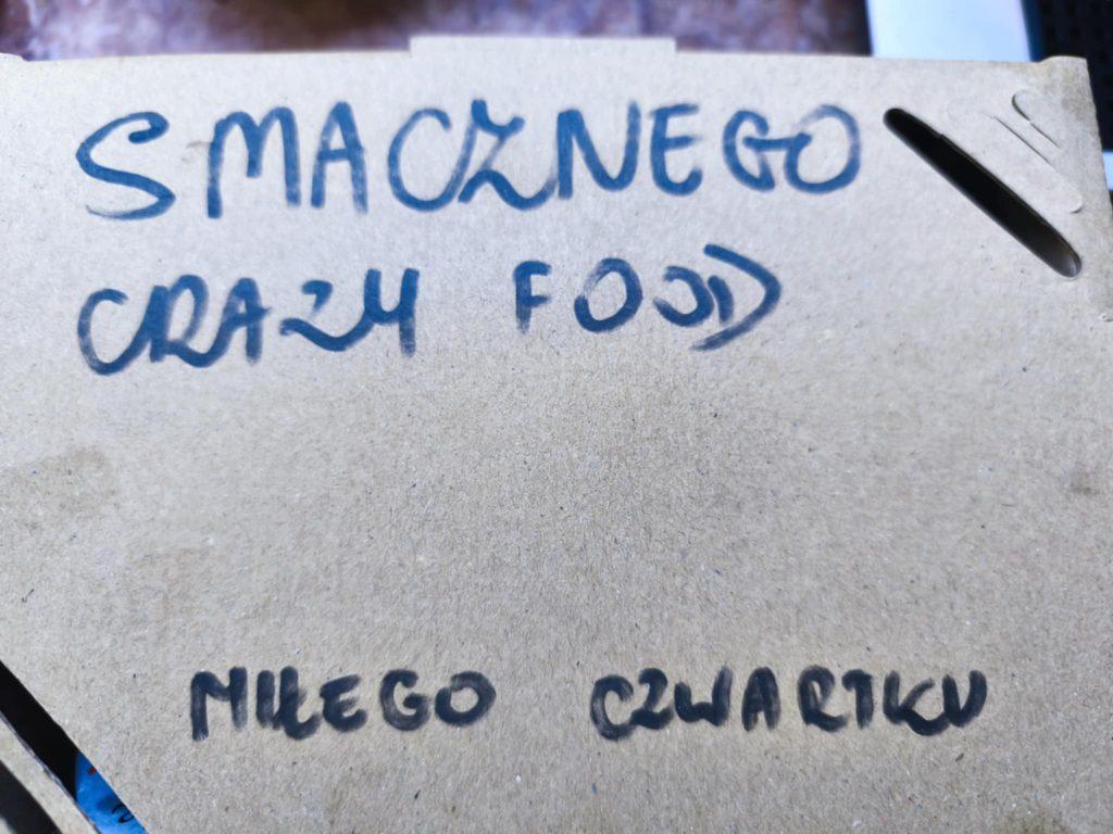 Spodziewaliśmy się klasycznej folii aluminiowej, a tymczasem otrzymaliśmy estetycznie przygotowany, dopracowany zestaw. Burger zapakowany był w eleganckie kartonowe pudełko, a w środku owinięty w specjalną folię termoizolacyjną, która doskonale trzymała ciepło. Na pudełku widniał napis „Smacznego! Crazy Food” oraz życzenia miłego czwartku — miły detal, który od razu poprawia humor.