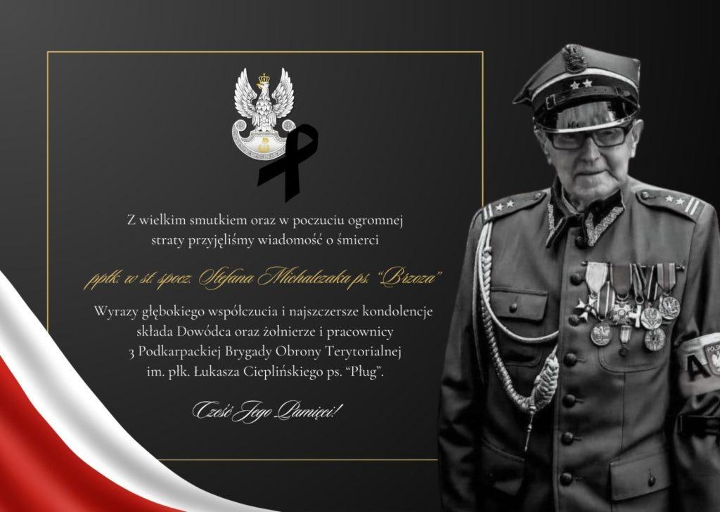 Z głębokim żalem przyjęliśmy wiadomość o śmierci ppłk. w stanie spoczynku Stefana Michalczaka, ps. „Brzoza” – żołnierza Związku Walki Zbrojnej i Armii Krajowej, Kawalera Orderu Odrodzenia Polski, Weterana Walk o Wolność i Niepodległość Ojczyzny. Był Honorowym Prezesem Koła Rzeszów ŚZŻAK, zaangażowanym działaczem społecznym i zasłużonym obywatelem Województwa Podkarpackiego. Aktywnie wspierał działania 3 Podkarpackiej Brygady Obrony Terytorialnej, uczestniczył w ważnych wydarzeniach, służył radą i dzielił się doświadczeniem z młodszym pokoleniem żołnierzy. Członek Klubu Historycznego im. płk. Łukasza Cieplińskiego, bliski współpracownik IPN i wierny przyjaciel Terytorialsów – niezłomny świadek historii i prawdziwy patriota.