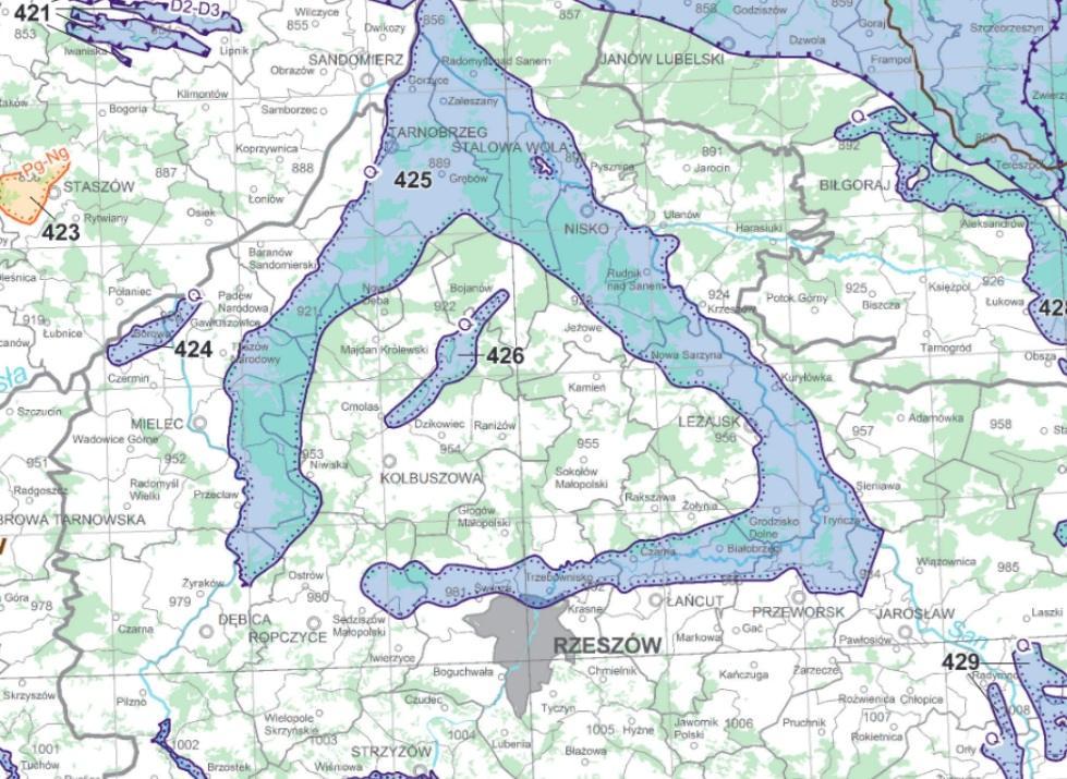 Główny Zbiornik Wód Podziemnych nr 425 to ogromny magazyn czystej wody. Swoim zasięgiem obejmuje znaczną część gminy Żyraków. Źródło: Państwowy Instytut Geologiczny