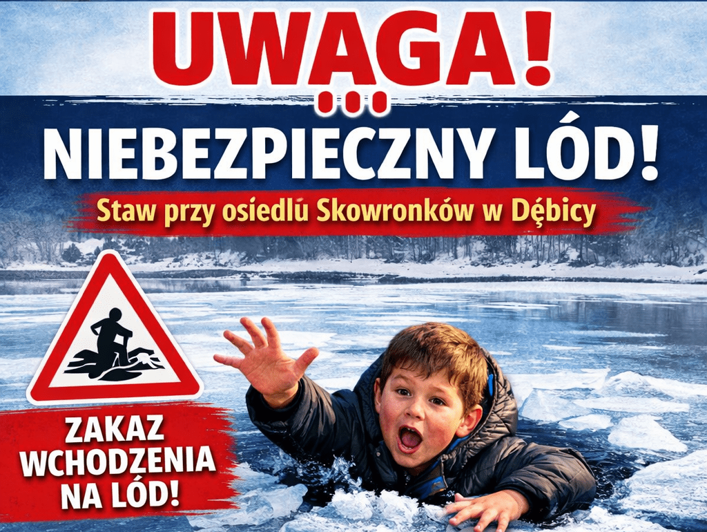 Każdego roku w Polsce dochodzi do dramatycznych zdarzeń związanych z załamaniem się lodu. Wystarczy chwila nieuwagi, by zabawa zamieniła się w tragedię. Mieszkańcy Dębicy proszeni są o zachowanie rozsądku i reagowanie, gdy zauważą osoby wchodzące na zamarznięty staw.